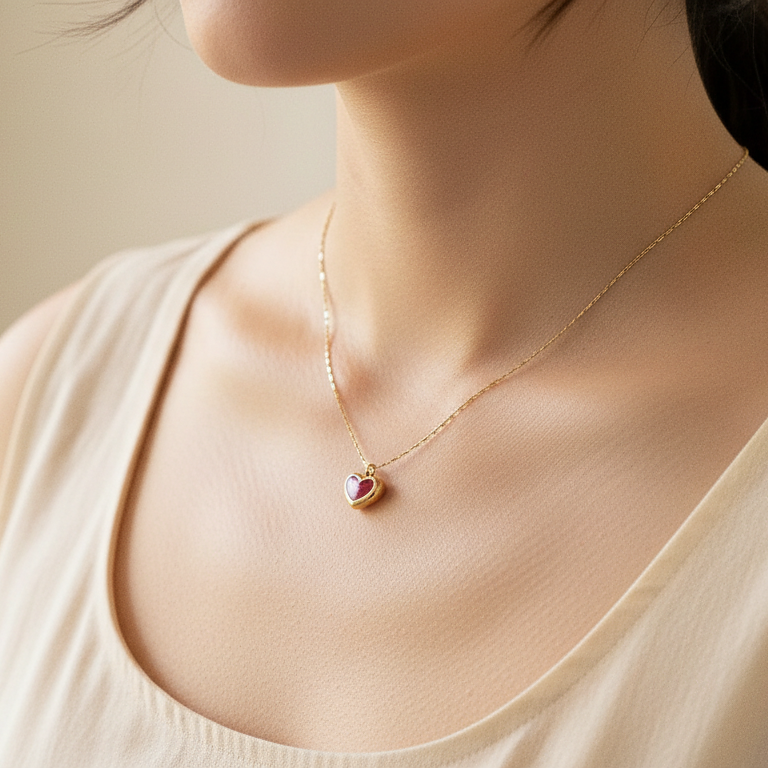 Collier fin en acier inoxydable, orné d’un pendentif cœur rouge aux détails dorés. Un bijou délicat et intemporel, symbole d’amour et de féminité, parfait comme cadeau.