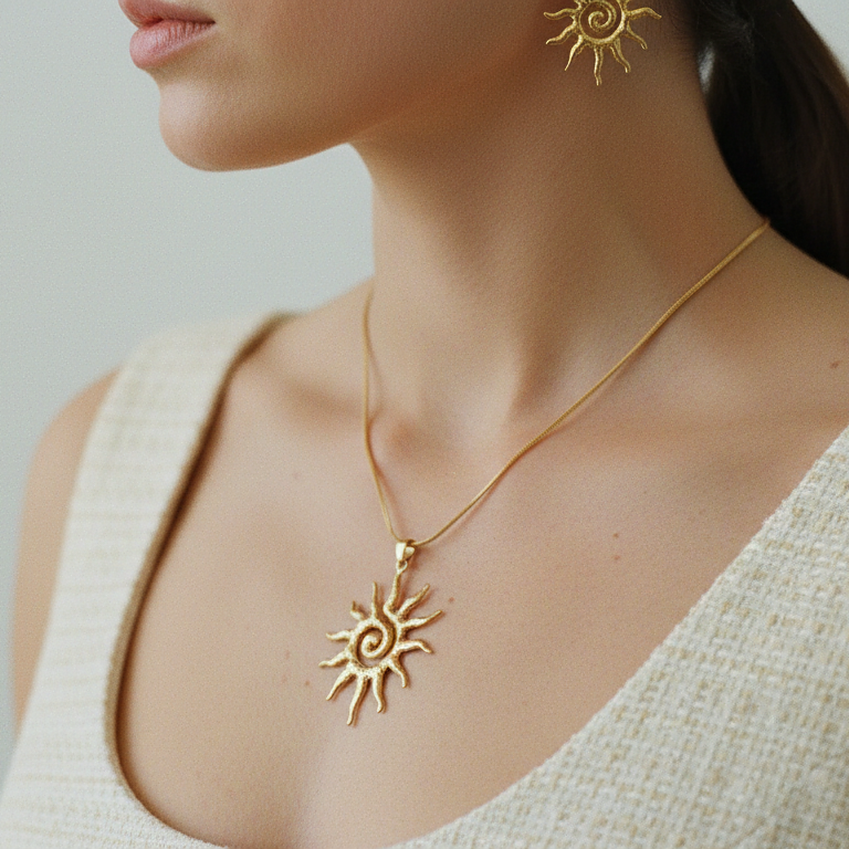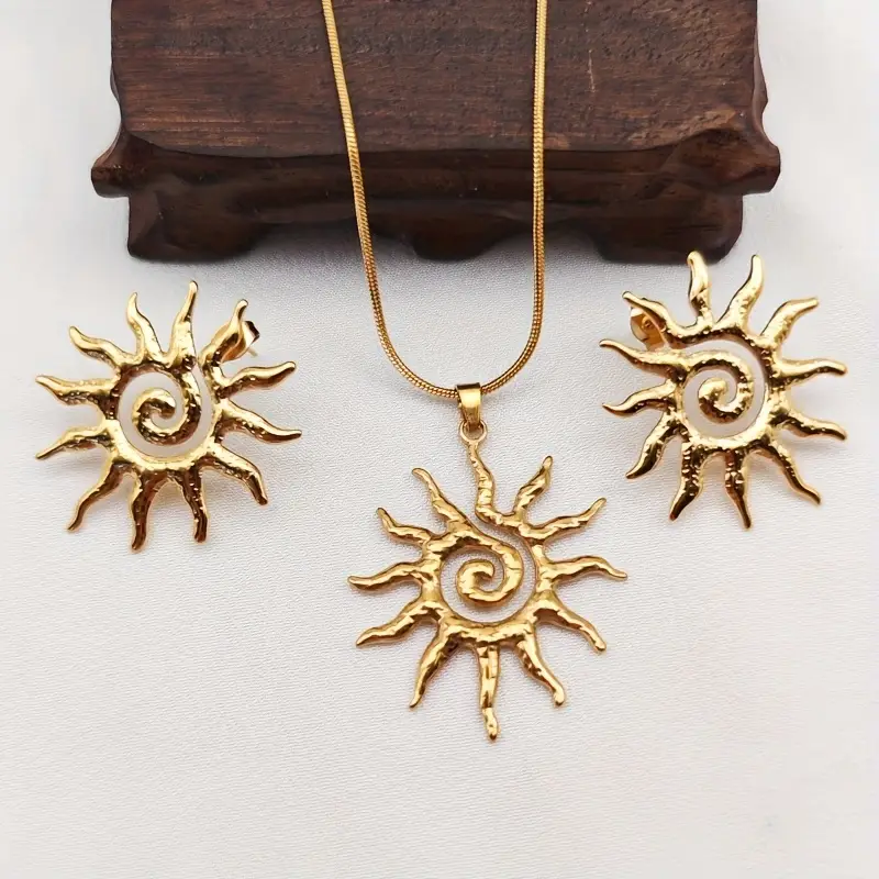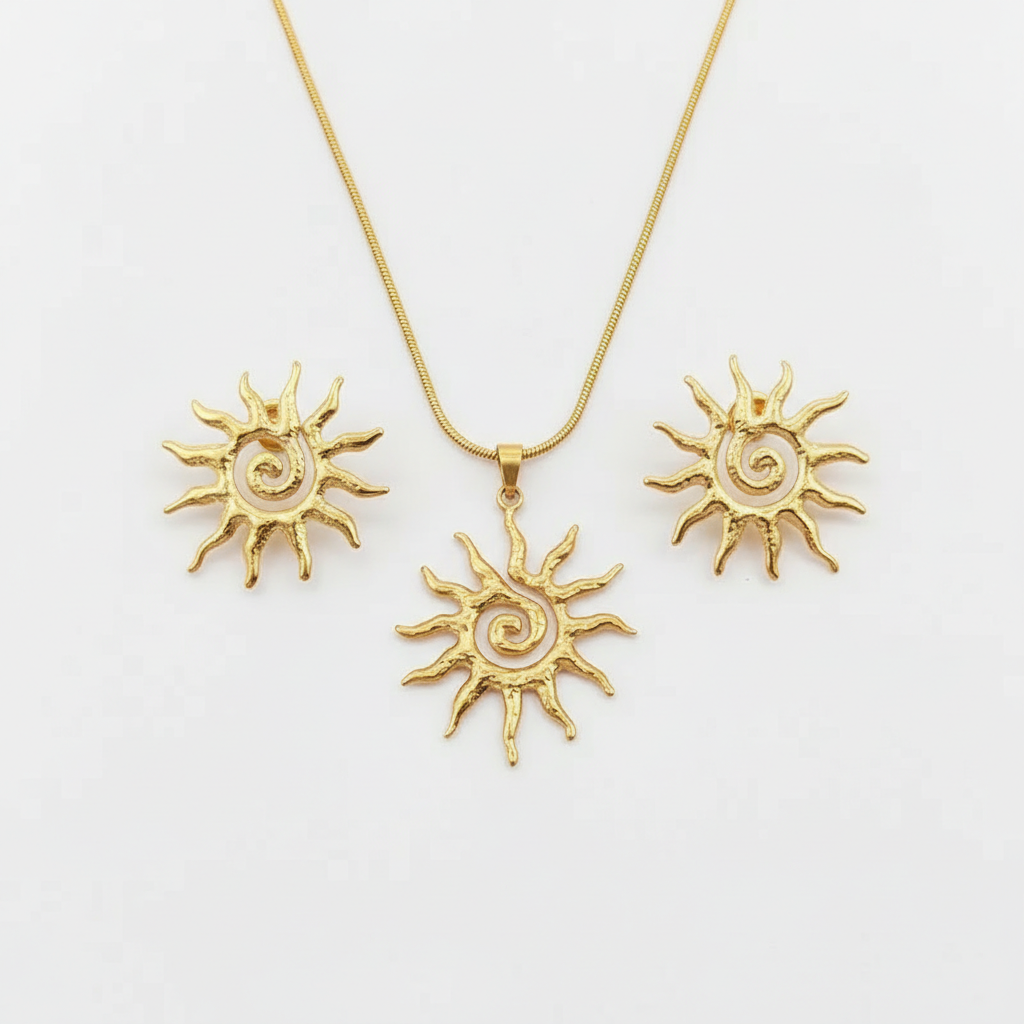 Ensemble collier et boucles d’oreilles dorés en forme de soleil en acier inoxydable 316L pour une allure rayonnante et affirmée.