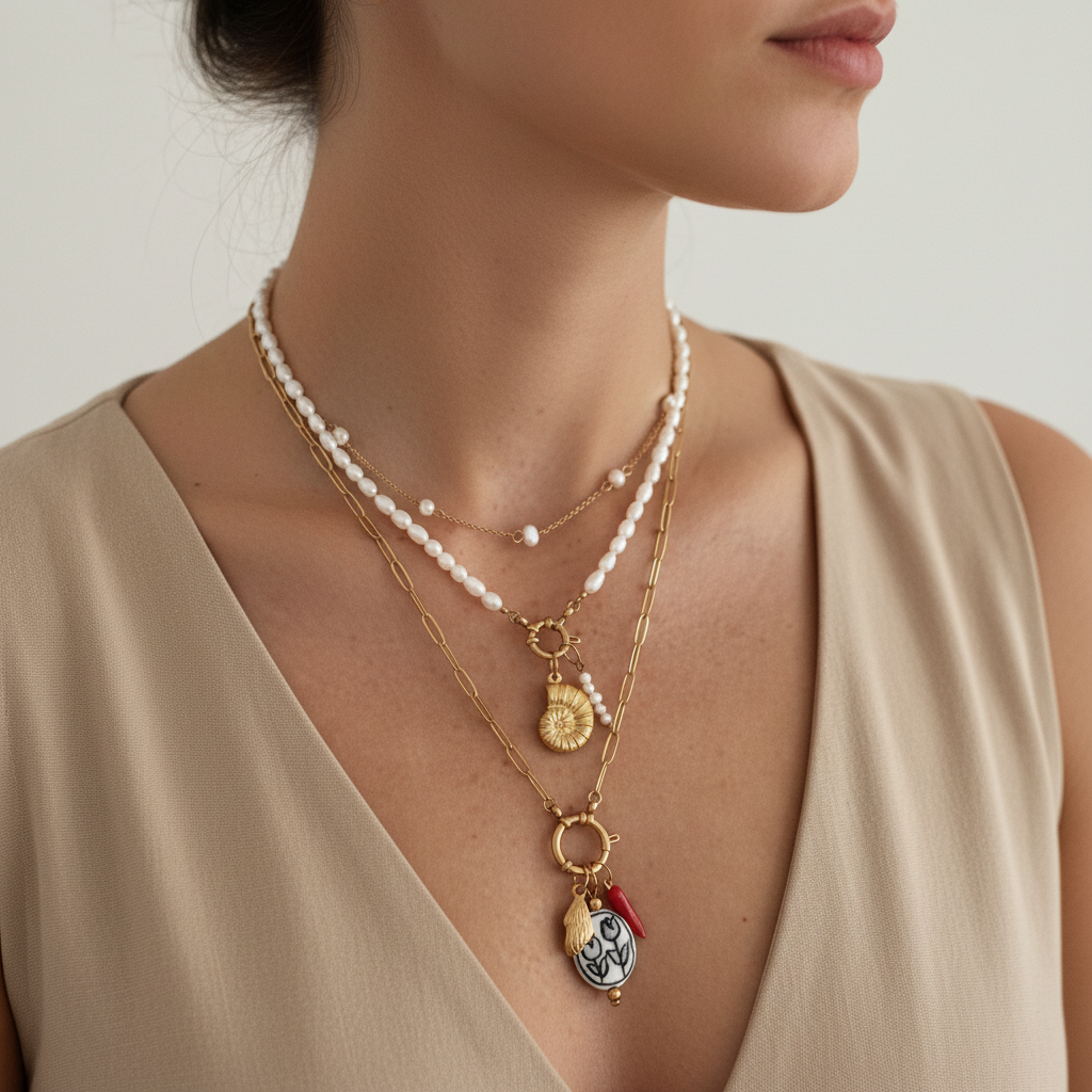 Collier multirang (trois niveaux) en métal doré, combinant élégamment des perles de riz d'eau douce avec deux longues chaînes à maillons de type paperclip. Chaque chaîne est ornée de breloques d'inspiration maritime ou méditerranéenne, incluant un coquillage nautile et un pendentif émaillé à motif floral accompagné d'un piment. Une pièce tendance et sophistiquée pour un look layering estival.
