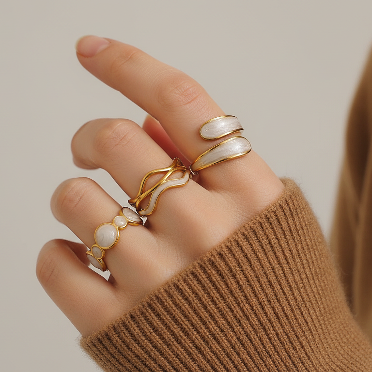Ensemble de bagues dorées au détail blanc nacré offrant des designs modernes et élégants. Ajustables, en acier inoxydable 316L.
